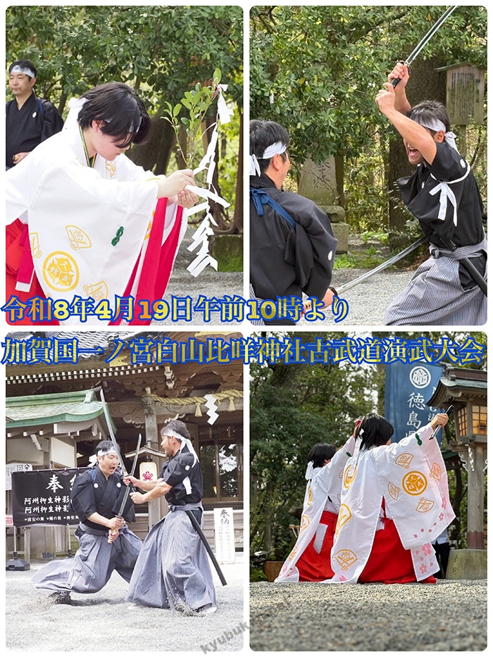 令和8年4月19日に念願だった加賀国一宮白山比咩神社、勧進帳で有名な「安宅の関」に鎮座する安宅住吉神社で古武道演武大会を開催いたします。